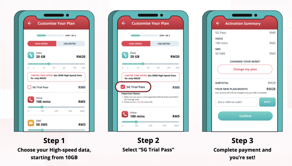 Make sure you choose High-Speed data, then get at least 10GB. Next, don’t forget to toggle the ‘5G Trial Pass’ option. Finally, you just need to confirm your new Yoodo plan and you’ll be all set! Do note that the free 5G Trial Pass is only available for Android, though iOS compatibility is coming soon!