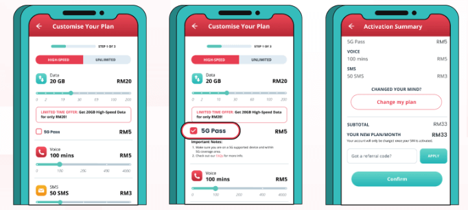 Want 0 SMS? No problem! Want tons of data? Sure, you can just select a 40GB–100GB base data plan and get an extra 25GB for FREE. The best part? Getting this promo means you can also enjoy our 5G Pass for only RM1/mth!
