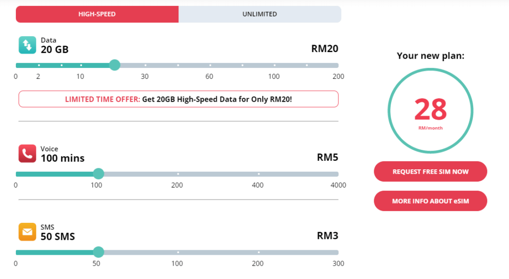 20GB High-Speed data + 100 voice minutes + 50 SMS = RM28/month