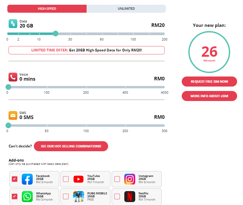 20GB High-Speed data + 20GB WhatsApp & Facebook Add-Ons = RM26/month
