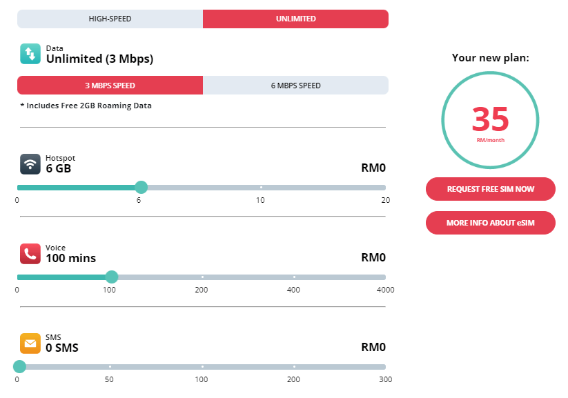 Not a fan of limits? Go Unlimited! For only RM35, you get fully uncapped data with 3Mbps internet speeds. This is perfect for streaming videos in standard-definition, general image sharing and music streaming on platforms like Spotify.